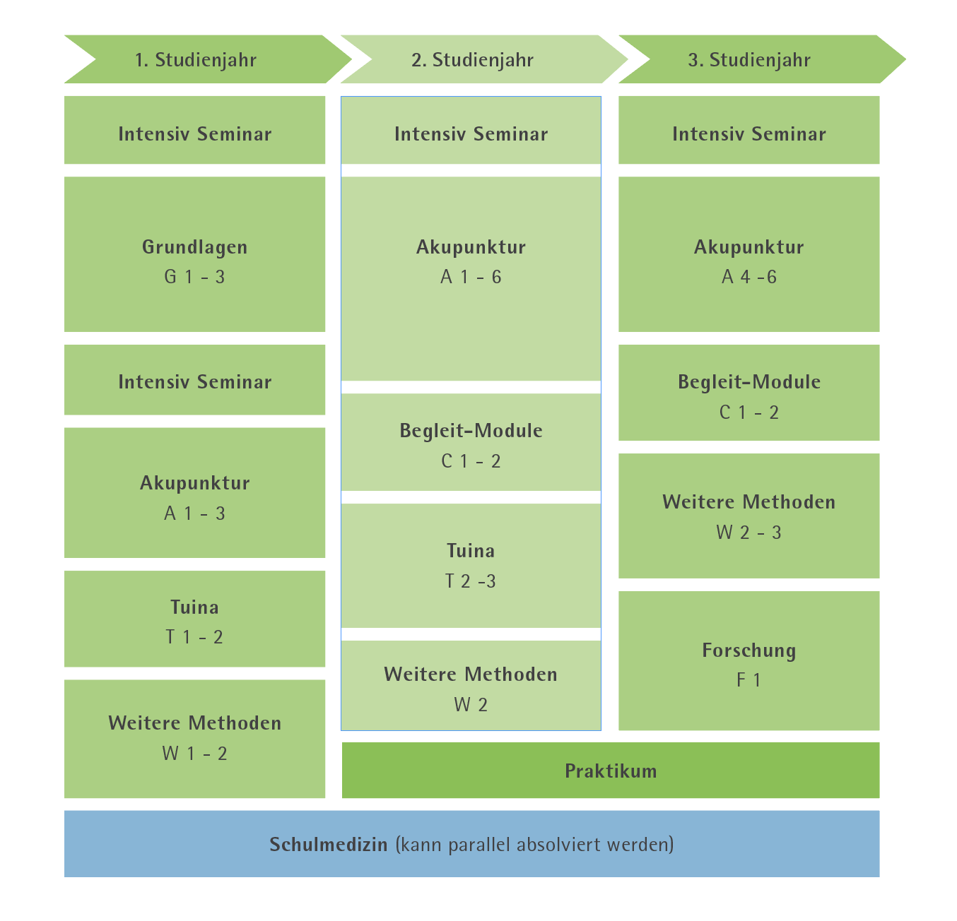 Es folgt die Behandlung von Krankheiten mit Akupunktur und verwandten Methoden – ein Modul in dem alles bisher Gelernte zusammen kommt und den Studierenden die Praxis der Akupunktur vermittelt.